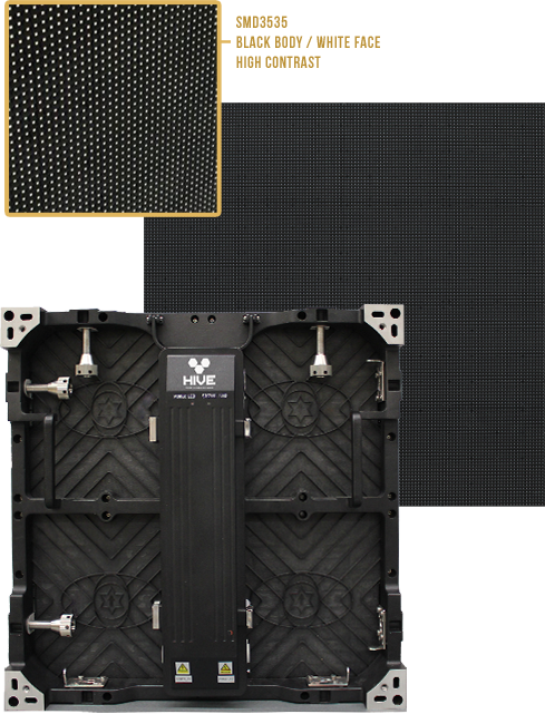 Designed for outdoor daylight rental applications, where quick installation and light-weight performance are essential. HIVE DCX Series delivers high resolution, high contrast images in a rigid yet light-weight diecast aluminum form factor. All cabinets in DCX series are 500mm x 500mm. Assembly is achieved through a precision tensionable bayonet system and allows panels to be removed from the center of an existing screen for easy maintenance.TECHNICAL SPECIFICATIONS: